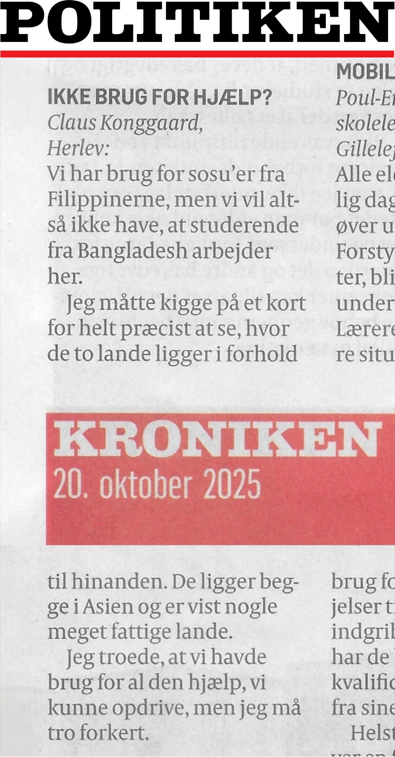 | Vi har brug for SOSU'er fra Filippinerne, for danskerne får stress. Men vi vil altså ikke have, arbejdende studiner fra Bangladesh. Dem fra Bangladesh er muslimer, det er man ikke så meget, som filippiner. |