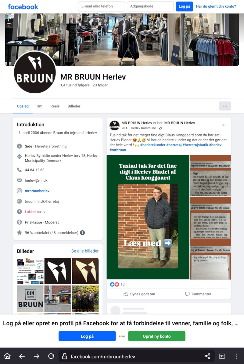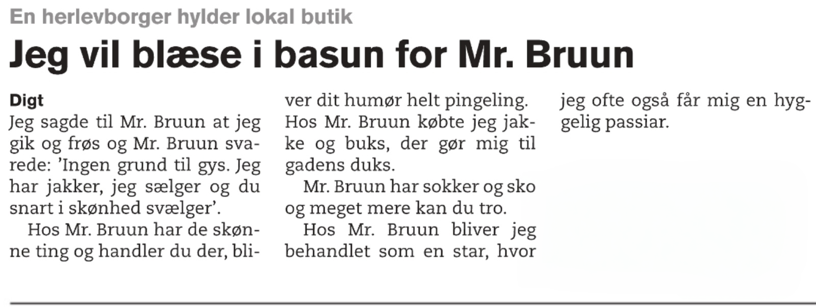 Jeg sagde til Mr. Bruun at jeg gik og frøs og Mr. Bruun svarede: "Ingen grund til gys. Jeg har jakker, jeg sælger og du snart i skønhed svælger". |